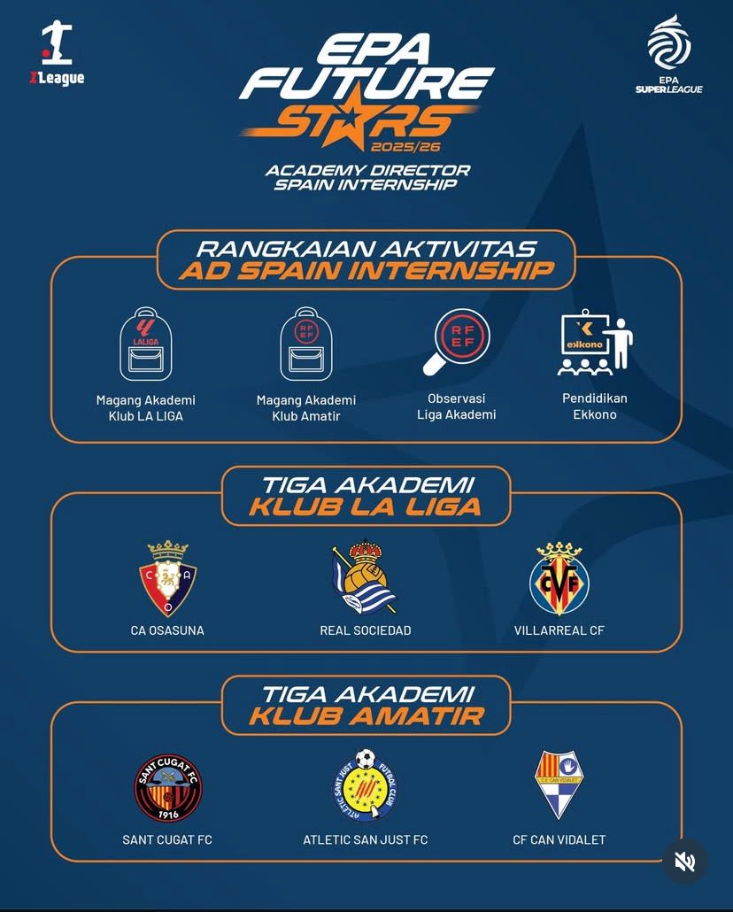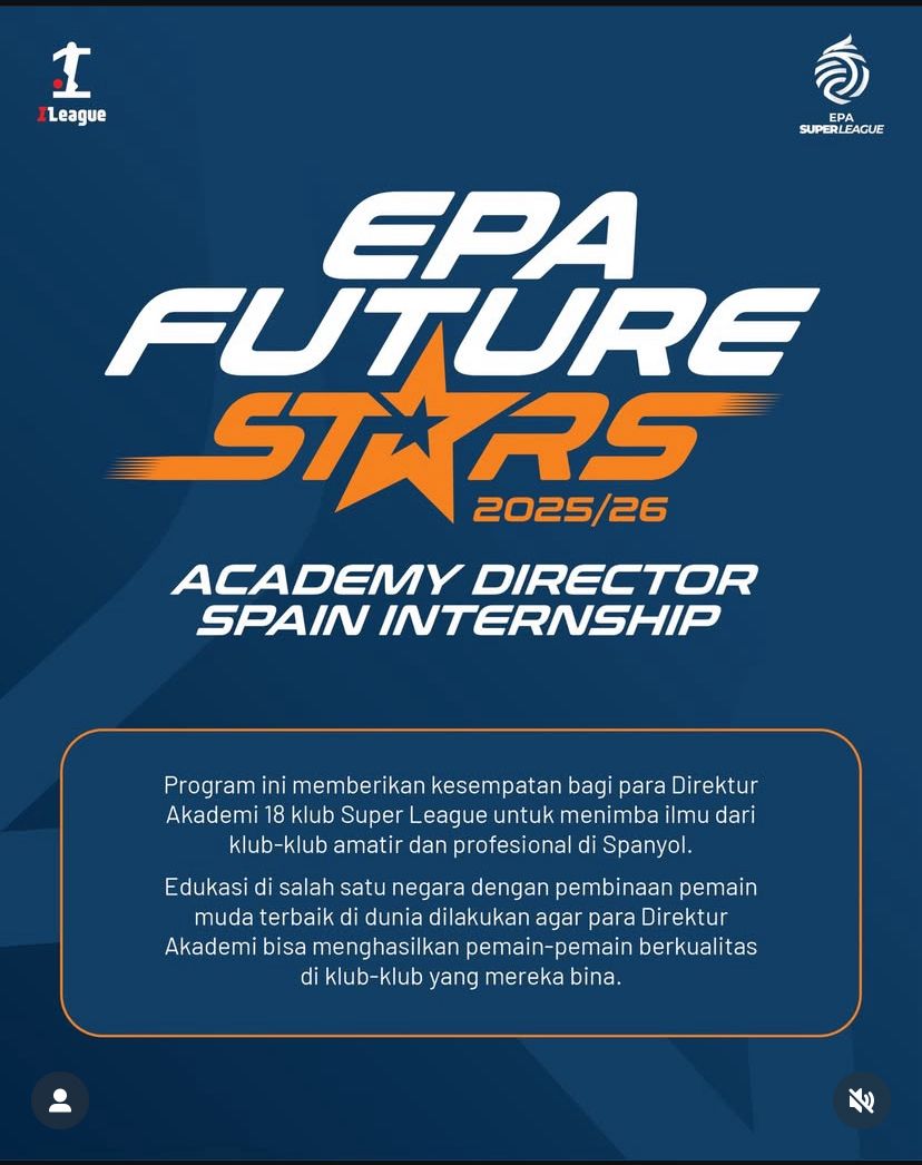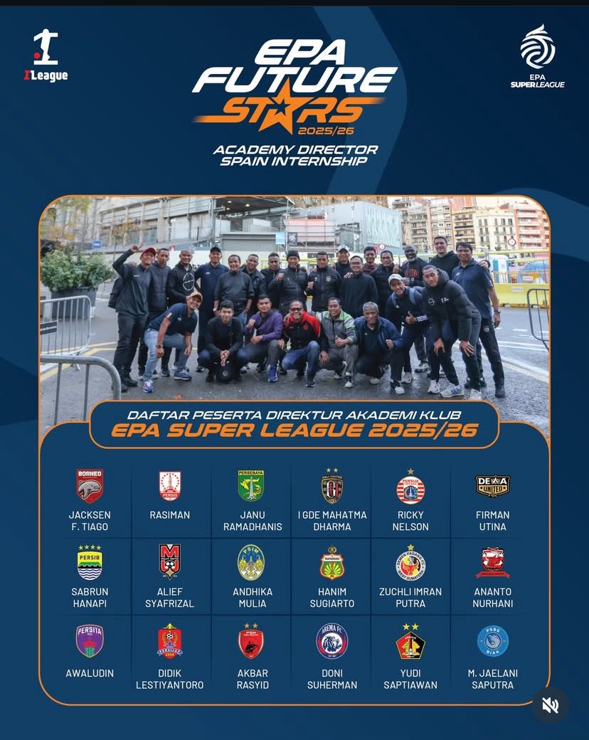 Sebagai bagian dari upaya memperkuat fondasi pembinaan usia muda Indonesia, program EPA Future Stars 2025/26 Academy Director Spain Internship kembali menghadirkan kesempatan berharga bagi 18 Direktur Akademi Klub EPA Super League. Mereka akan belajar langsung ke Spanyol selama dua minggu. Spanyol dipilih sebagai pusat pengembangan pemain kelas dunia dan merupakan homebase Ekkono Method Barcelona.